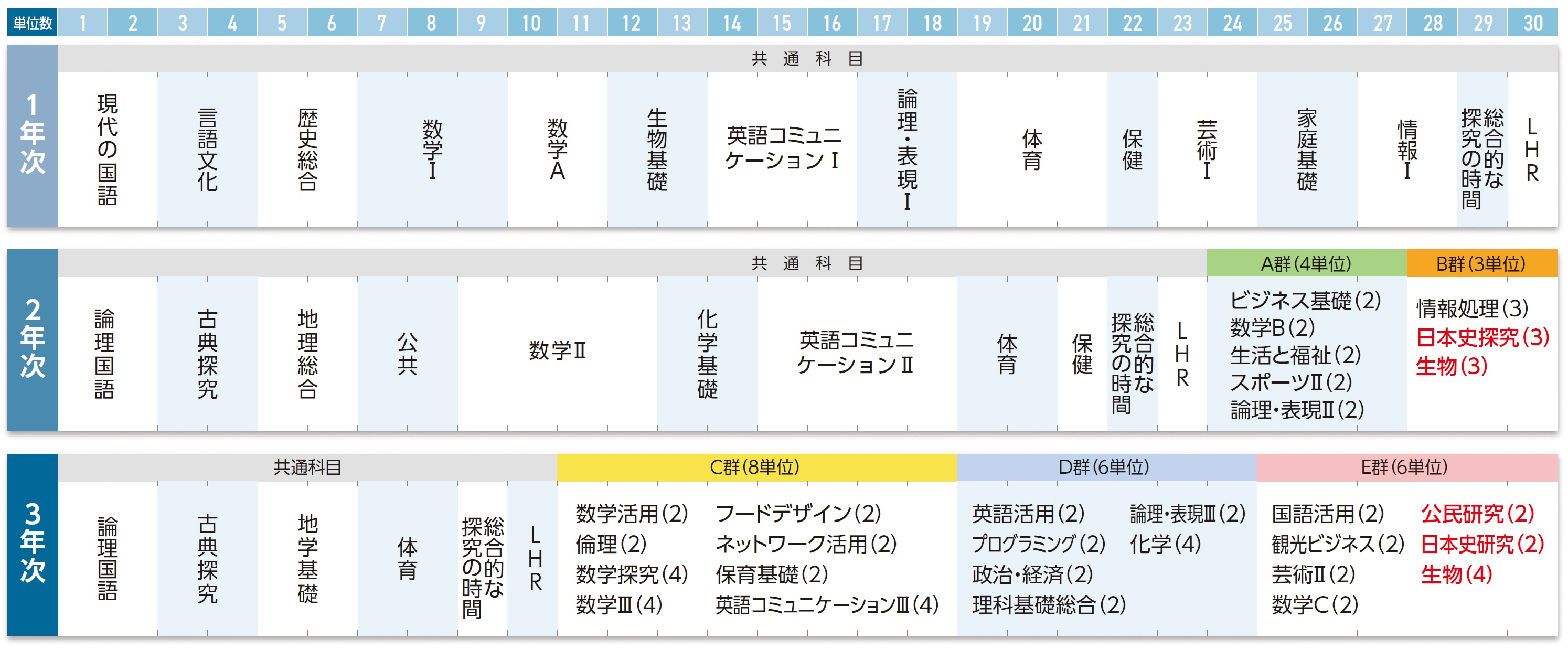 1年次では、共通の教科・科目を履修します。2年次になると7時間分、3年次になると20時間分の科目を各自で選択でき、一人一人のニーズに合わせた学習が可能になります。